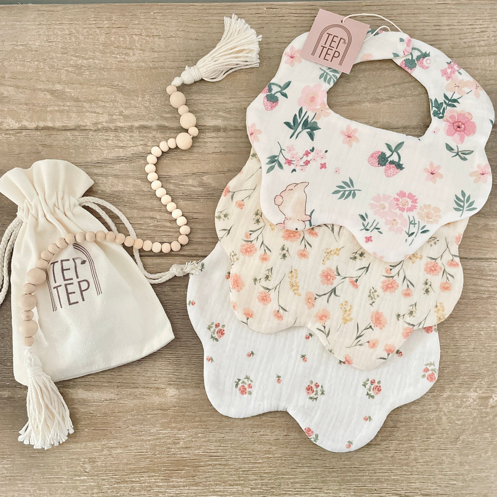 <Let our bibs absorb your baby's drool in style!>Our muslin bibs are an easy, practical and trendy solution to drooling/teething babies.