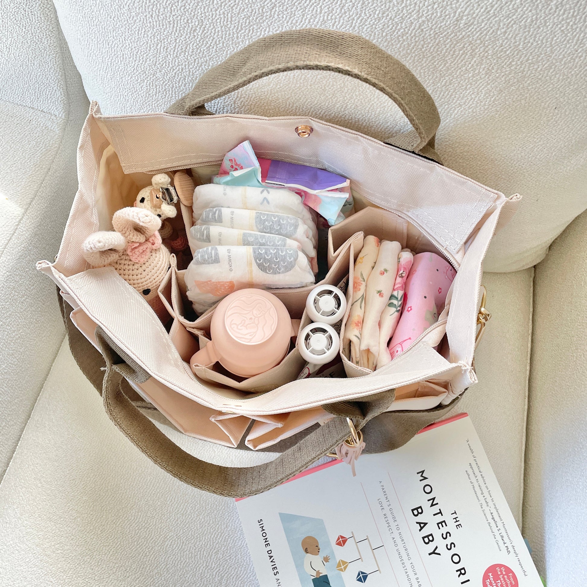 <Khaki/Blush Diaper Bag & OPTIONAL Personalized Bag Charm>